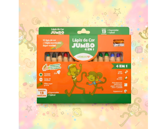 O Lápis de Cor Jumbo 13 Cores 4 em 1 - Leo&Leo é a escolha ideal para estimular a criatividade de crianças e artistas iniciantes. Com um design ergonômico e corpo mais grosso, é perfeito para mãos pequenas e proporciona maior controle e conforto na hora de desenhar. Seu grande diferencial está na tecnologia 4 em 1: funciona como lápis de cor, giz de cera, aquarela e lápis pastel, oferecendo versatilidade em um só produto. As cores são vibrantes, macias, de alta cobertura e fáceis de aplicar, garantindo uma experiência artística completa. Acompanha apontador especial, compatível com o formato jumbo.